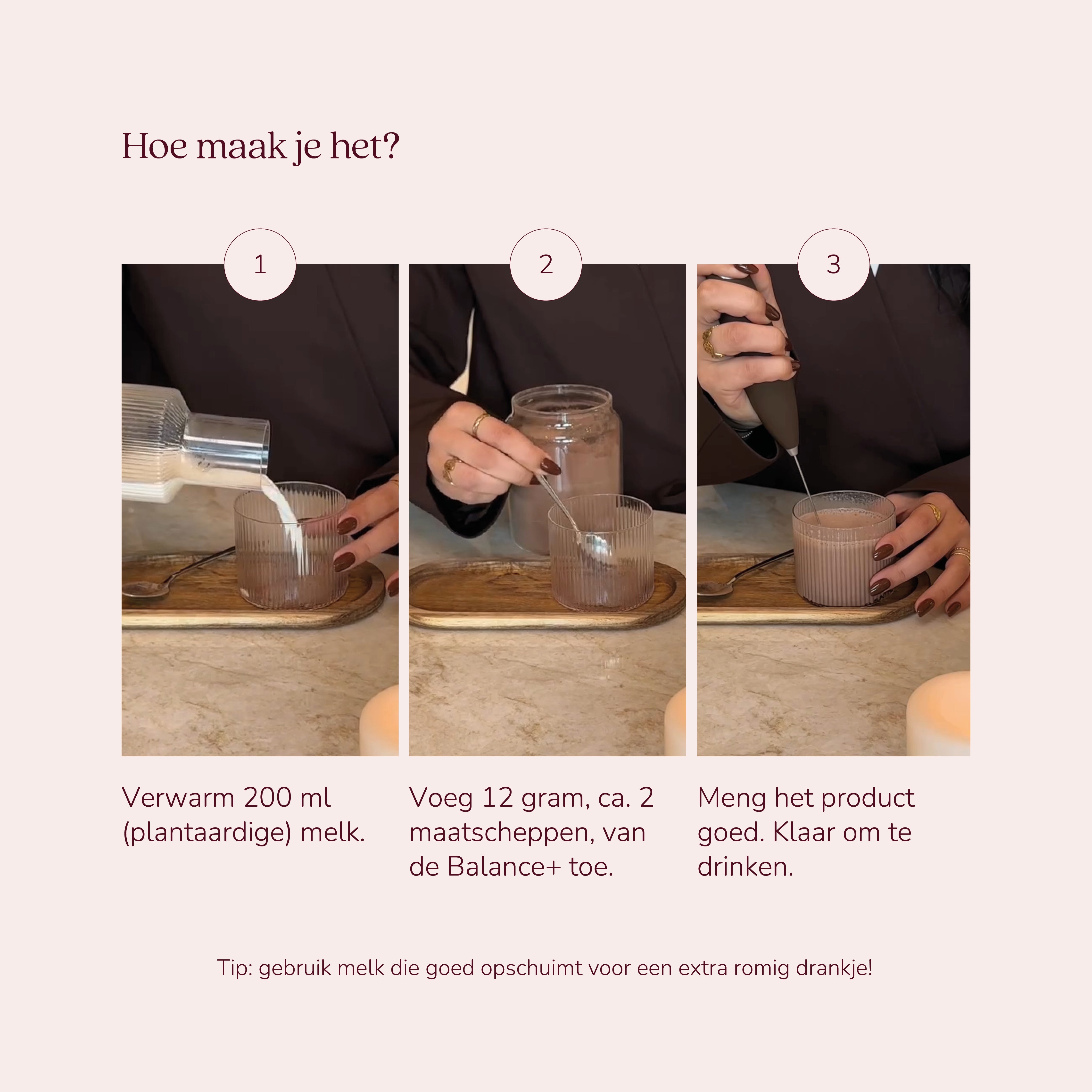 Balance+ was developed as a daily moment to slow down, recharge, and reconnect with yourself. With ingredients that have been used for centuries to promote focus, resilience, and inner balance, it is a creamy, warming drink that feels good and does you good.