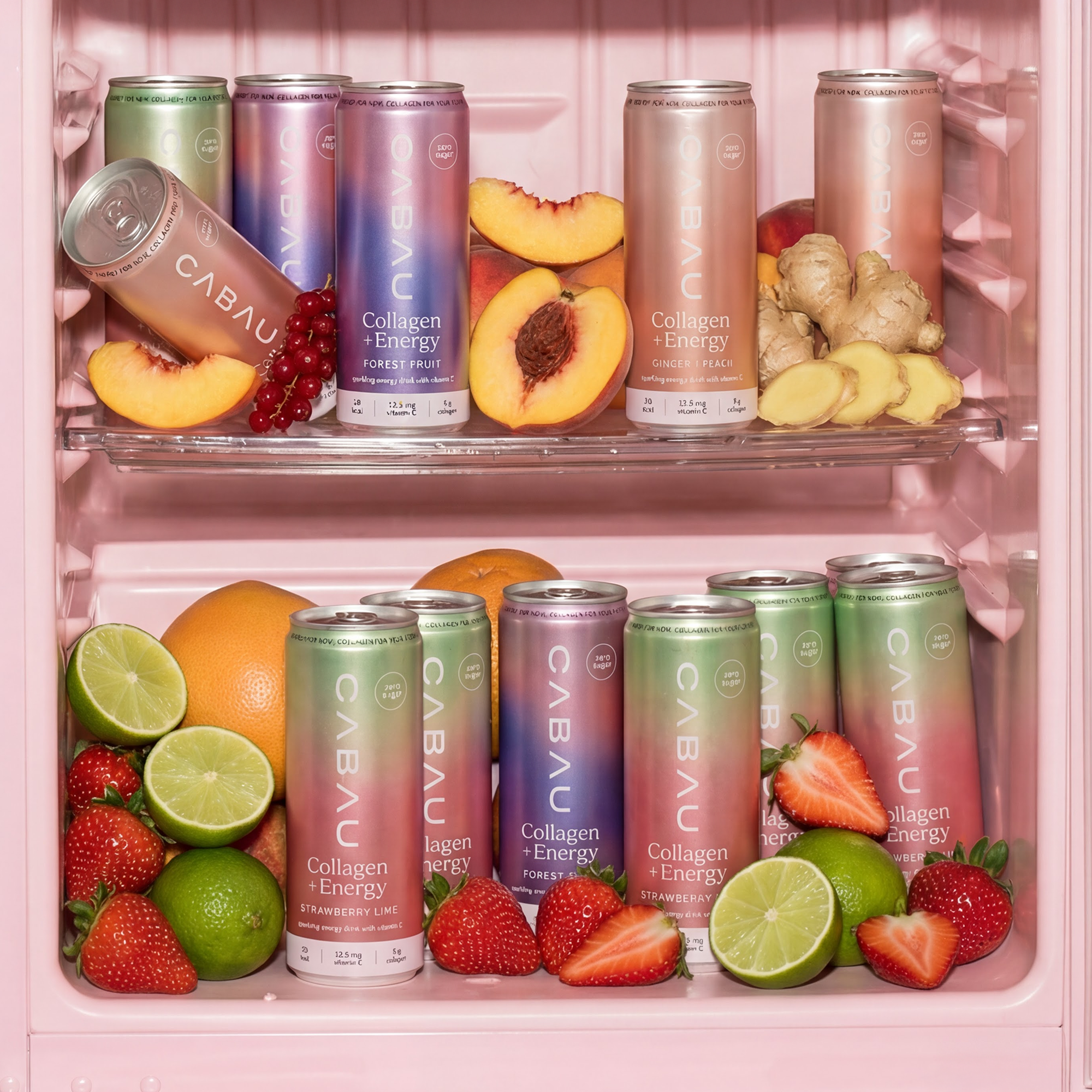 Carbonated water, marine collagen (fish), citric acid (E330), malic acid (E296), ascorbic acid (vitamin C, E300), flavourings (including strawberry and lime flavour), caffeine flavouring, sweeteners: sucralose (E955), acesulfame-K (E950).