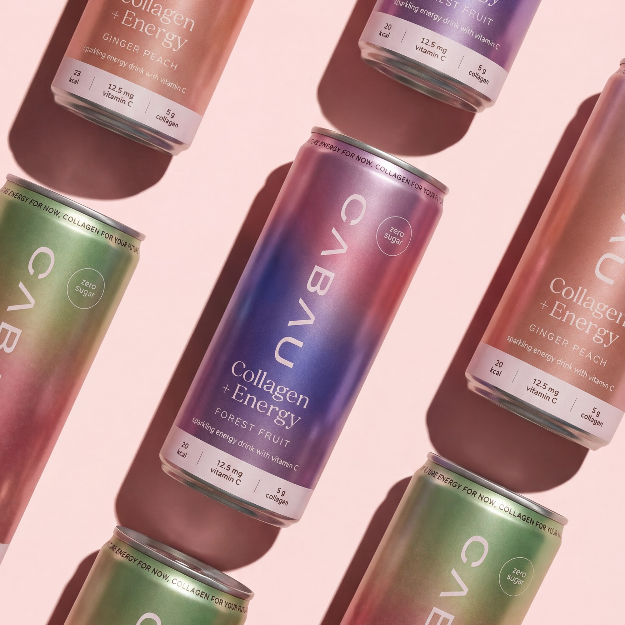 Carbonated water, marine collagen (fish), citric acid (E330), malic acid (E296), ascorbic acid (vitamin C, E300), flavourings (including blueberry and cherry flavour), caffeine flavouring, sweeteners: sucralose (E955), acesulfame-K (E950).