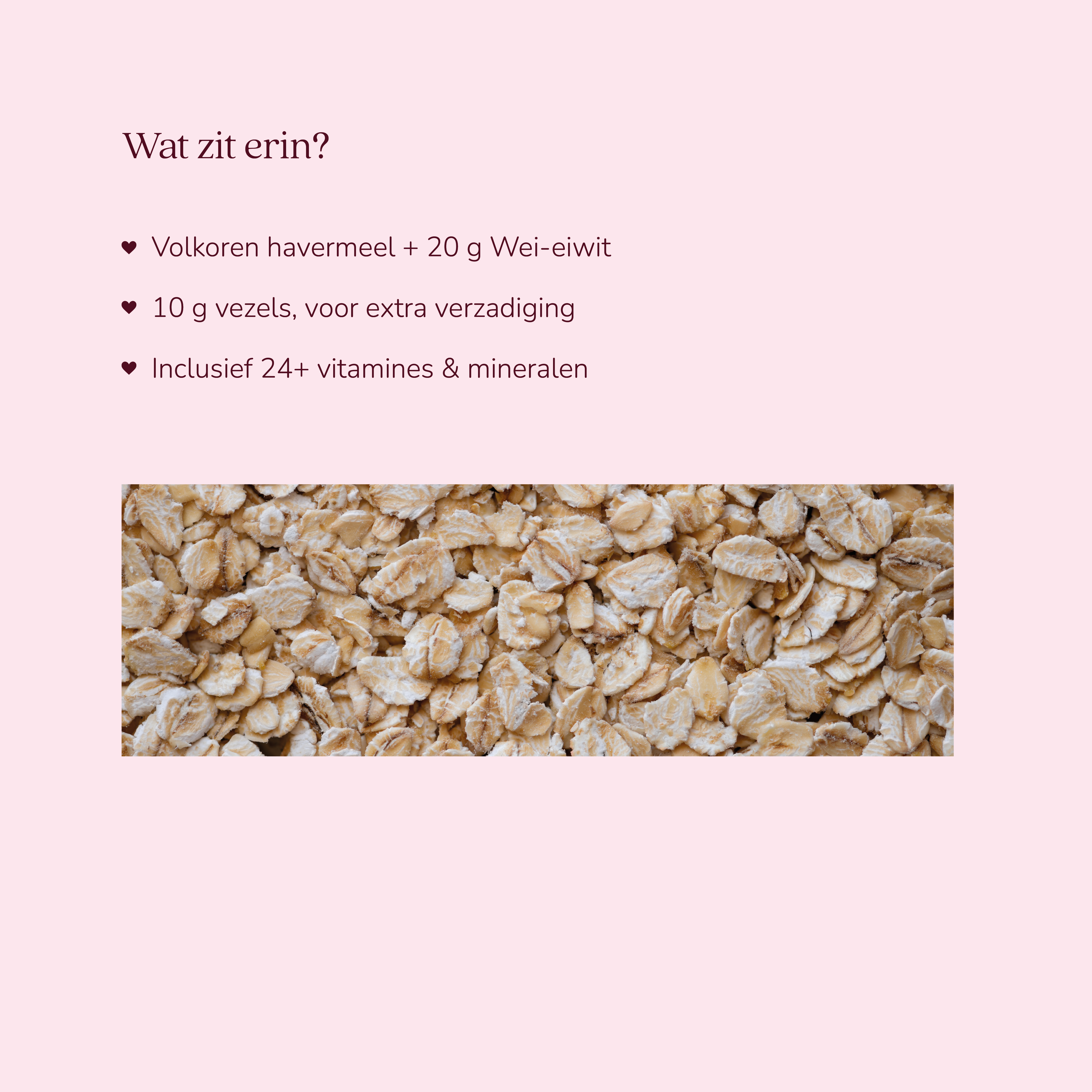 INGREDIENTEN: volkorenhavermeel (gluten), tuinboon eiwit isolaat, maltodextrine, inuline, natuurlijk aroma, calcium fosfaat tribasic, kaliumchloride, ascorbinezuur (vit. C), kalium fosfaat dibasic, tri-kaliumcitraat, magnesium oxide, zoetstof: sucralose, ijzer pyrofosfaat, zink sulfaat monohydraat, nicotinamide (vit. B3), DL-alfa-tocoferol, calcium-D-panthothenaat (vit. B5), mangaancitraat, pyridoxine (vit. B6), riboflavine (vit. B2), thiamine hydrochloride (vit. B1), kopergluconaat, vitamine A, foliumzuur (vit. B9), kaliumjodaat, natrium selenaat, chroom chloride, phyllochinon (vit. K1), biotine (vit. B8), natriummolybdaat, vitamin D2, cyanocobalamine (vit. B12).